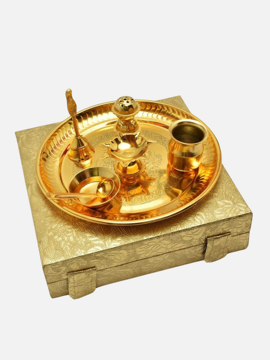 German Silver Gold Plated Pooja Thali With Royal Box