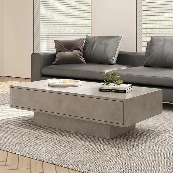 The simplistic design is both chic and functional. The coffee table offers modern, industrial concrete-coated table tops that will give a fresh new look to your living room. It looks like the texture of cement from a distance, but it feels warm to the touch. The surface paint process is stable, which avoids the problem of fragile cement. This coffee table beautifully marries form and function, contains double drawer storage and an open storage layer, and fits perfectly in a living room without crowding a space or sacrificing style.
